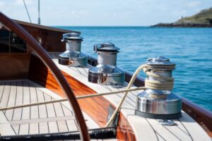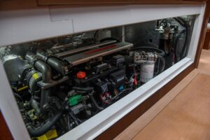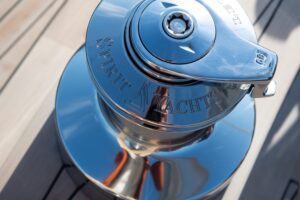 Her Bermudan sloop rig comes with high modulus carbon spars and EC3 standing rigging. On deck, Gwenhyfar II’s layout and sail handling systems are set up for easy handling, facilitated by modern deck gear and equipment.