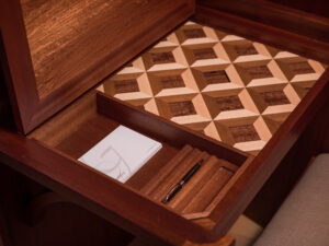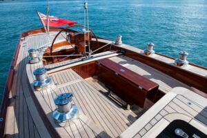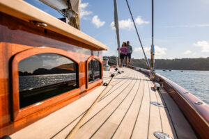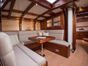 Stepping down into Gwenhyfar II’s interior, you cannot help but admire the beauty of her design and craftsmanship. The view from the base of the companionway steps through the interior, showcases the warm, natural timbers used in her build, revealing a timelessly elegant space.