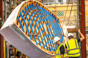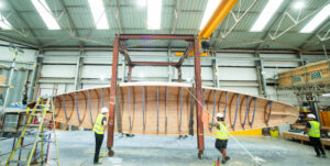 Spirit Yachts’ Production & Design Director, Julian Weatherill, commented, “The rollover is a showcase of Spirit craftsmanship, revealing the inside of the timber hull construction. It is a visually impressive process as it involves lifting the hull and turning it over to allow the team to start fitting it out. During the next stage, the customised interior will take shape; bulkheads will go in, furniture will be fitted, and electrical cabling run in.”